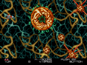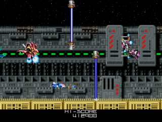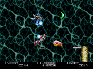 Like most arcade games, BlaZeon is crushing on its default difficulty. However, the difficulty doesn’t just come from its high bullet count. At times, players will have to maneuver through high speed obstacle courses and hop from cyborg to cyborg to make it to the end of the stage. Like Gradius, many enemies are placed in awkward places, forcing the player to wisely choose their targets when not in a cyborg. Available via dipswitches are four difficulty options: Easy, Normal, Hard, and Hardest. Mercifully, the player is granted unlimited continues so long as quarters are being fed. Shmup veterans will feel right at home piloting the Garland.