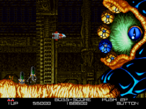 BlaZeon features challenging and inspired bosses, such as a missile firing giant plant and a boss slightly resembling a pachinko machine. The bosses operate on a timer, rewarding players bonus points the quicker they are defeated. When the timer hits zero, the boss self-destructs and no bonus is rewarded. Bosses have multiple destructible segments which, when destroyed, change their attack patterns. Players will have their skills and reflexes put to the test when facing Blazeon‘s bosses.