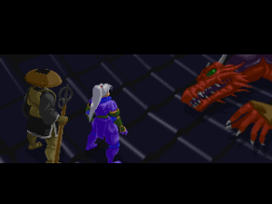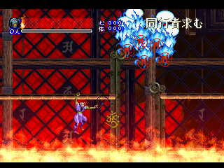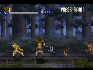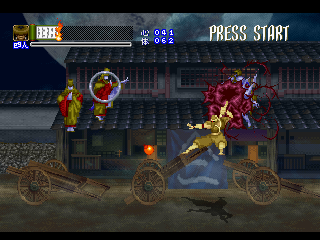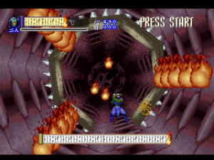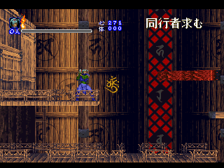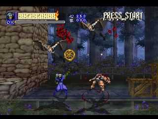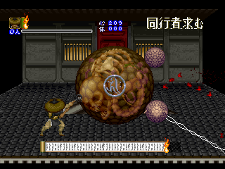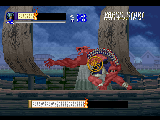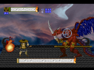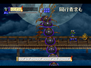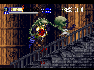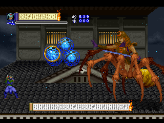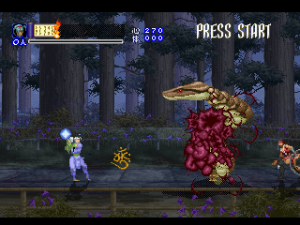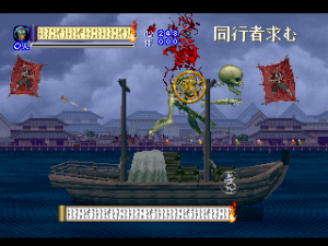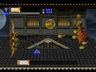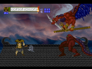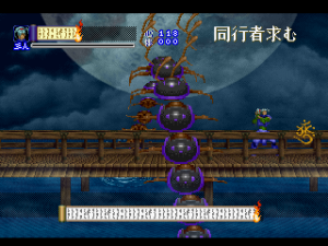 Since it was designed for the Saturn hardware, it’s not quite as graphically impressive as any similar games on the PlayStation, as the textures are pretty blotchy. Similarly, some of the main sprites look a bit pixelated, like they were designed for a lower resolution. Still, there are some pretty amazing effects – the multi-segmented bosses may not be as huge as in Castlevania: Symphony of the Night (which came out a few months after Shinrei Jusatsushi Taroumaru) but they’re just as well animated. The Saturn could also pull off some pretty amazing water effects (see also: Radiant Silvergun), and Shinrei Jusatsushi Taroumaru has the most gorgeous “burning town” level since Dracula X on the SNES. Most of the music consists of Japanese style instrumentations with some synth. It’s not bad, but it rarely sticks out.