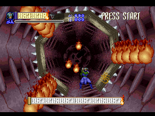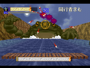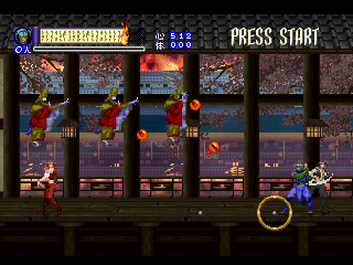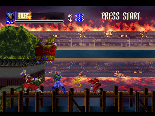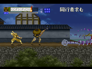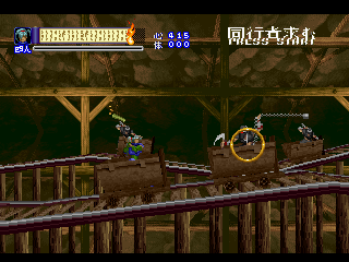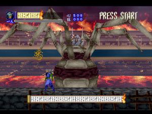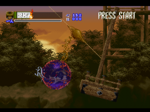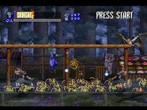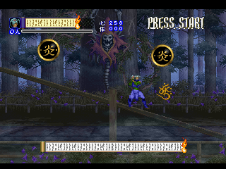 Shinrei Jusatsushi Taroumaru is a sidescrolling 2.5D action game featuring sprites for the main characters and polygons for the backgrounds, similar to Klonoa. You can play as one of two characters – the ninja Taroumaru and his buddy Enkai, who wears a huge straw hat and looks very similar to Sokazku Mochizuki from Fatal Fury. Other than some minor discrepancies with attack ranges, they’re mostly identical. The setting is vaguely similar to Sega’s old Mystic Defender / Kujaku Ou series, in that you’re fighting mythical bad guys in a medieval Japanese setting. It also tends to draw comparisons to classic Konami and Treasure games, mostly due to its level structure, featuring tightly designed set pieces and a ton of amazing boss encounters. The only real relation to Treasure is that one of the graphical designers was Hiroshi Iuchi, who worked on visuals in earlier titles like Gunstar Heroes, then later returned to Treasure to direct Radiant Silvergun and Ikaruga.