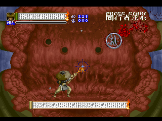 Since Shinrei Jusatsushi Taroumaru feels like it was designed to be an arcade game (though despite many rumors, it doesn’t actually appear to have had an arcade release), you can forget about being properly balanced, because enemies attack in huge numbers and the bosses litter the screen with tiny projectiles. Despite this, your life meter is pretty generous, and you resurrect immediately where you left off when you die or continue. Although you have a limited number of credits, Shinrei Jusatsushi Taroumaru isn’t particularly long, and can generally be beaten without much trouble within roughly half an hour. Although the game is technically divided into chapters, each stage segues into each other beautifully, without any break for loading time.