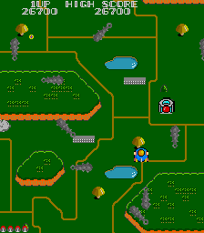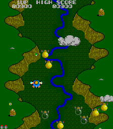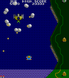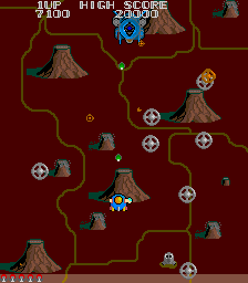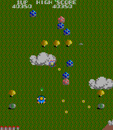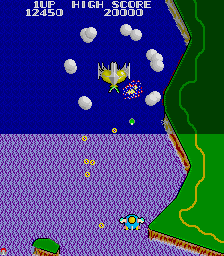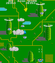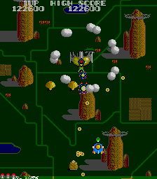 The other departure from Xevious is the power-up system. Whenever you shoot a cloud, a bell pops out of it. Regular yellow bells will add points to your score, and grabbing several yellow bells in succession will increase the bonus. However, if you shoot them, they’ll change colors and become useful power-ups. A blue bell is a speed up, the white bell powers up your weapon with a double shot, the red bell will create a shield and the green bell will add “bunshin” mirror Options that mimic your ship’s fire. You cannot equip the Options and the shield at the same time.