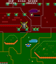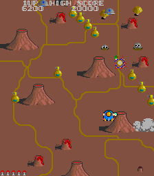 Further, destroyed ground targets yield different items. Most of the time you’ll just find fruit for a minor score bonus, but occasionally you’ll find a star which destroys all enemies on the screen (except for bosses), and a ground bell (candy in the home ports), which grants a three-way shot. If you already have a three-way shot, you can also find a “miracle ball”, which is a baseball that will fly around the screen and destroy things.